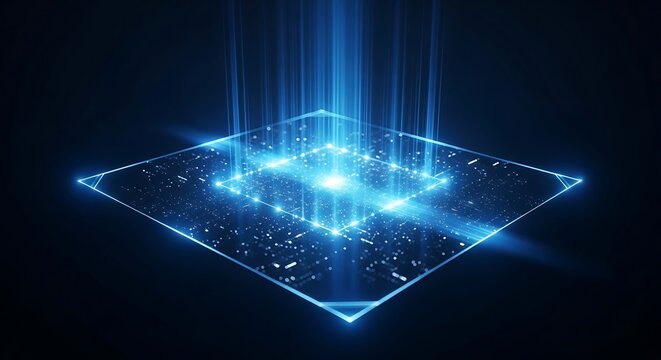 Futuristic digital hexagon with glowing blue light.