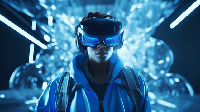 A stunning woman in sci-fi neonpunk style, wearing futuristic VR eyewear, symbolizing the integration of artificial intelligence, virtual reality, and metaverse technology.