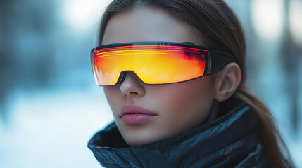 A stunning woman in sci-fi neonpunk style, wearing futuristic VR eyewear, symbolizing the integration of artificial intelligence, virtual reality, and metaverse technology.