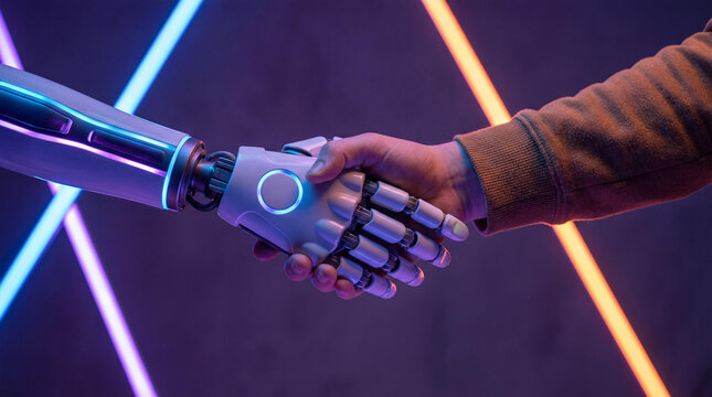 Robot and Human Handshake in Futuristic Technology Agreement - Stock Photo