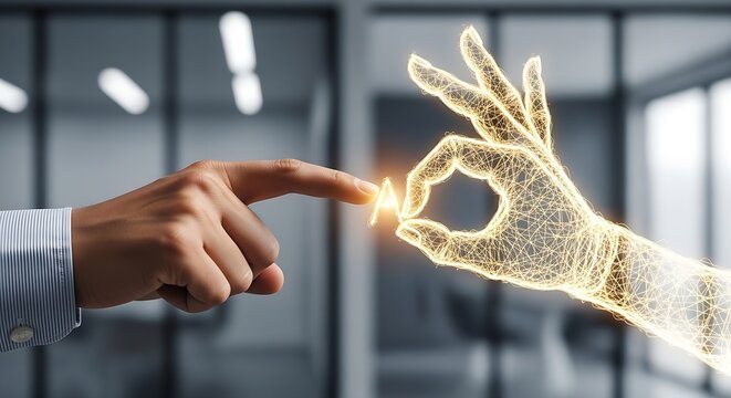Hand interacting with holographic gears display in a modern office environment setting indoors