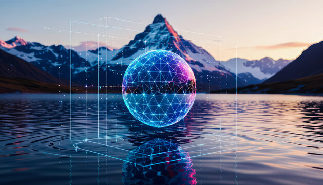 Futuristic digital interface with technology scanning and virtual terrain