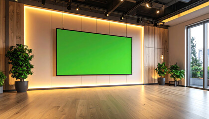 Modern studio backdrop, city view, green screens, presentation table