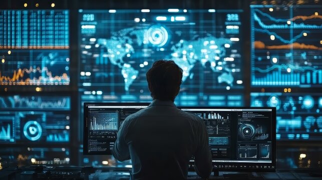 Analytics finance concept: Data management for finance, operations, and business intelligence analytics with man working on virtual screen.