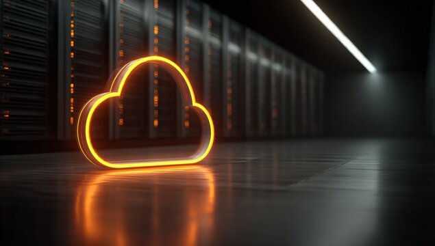 Futuristic server room with glowing data racks and a bright blue neon cloud icon