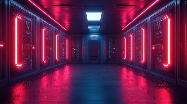 Abstract view of illuminated server racks in a modern data center with bokeh effect