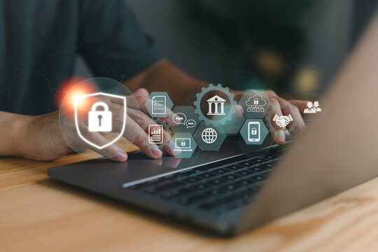The laptop displaying a security shield symbol for cybersecurity protection.