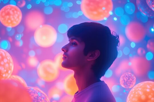 Two hands reach towards a digital sphere of abstract patterns against a pink background.