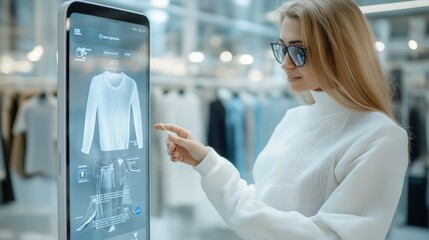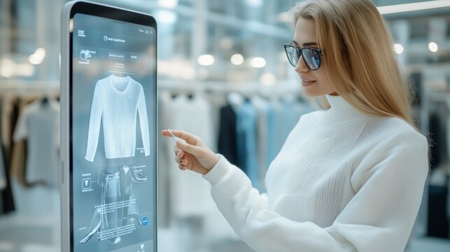 Augmented reality mirror displaying virtual clothing choices on customer using interactive AI assistant. AI generated