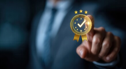Businessman touching a virtual award ribbon with a checkmark and stars icon on a transparent screen, representing quality and high performance. The image features a white and.