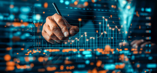 Managing e-commerce. Business person working on a virtual screen with commercial data and indicators. Drawing digital graph.