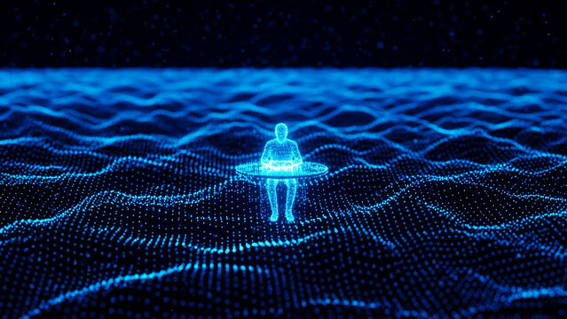 Solitary figure navigating a digital wavescape