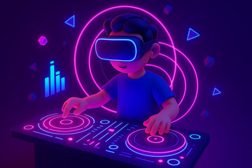 Modern 3D digital artwork of virtual music DJ in VR headset with neon lights and sound waves creating futuristic entertainment visuals
