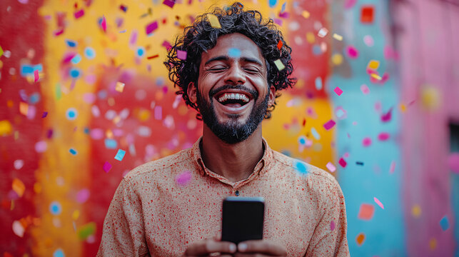 Joyful Indian man wins lottery on smartphone, receives cashback through mobile app message, against colorful backdrop.