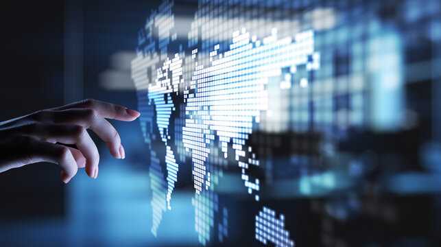 Global Market Analysis: A digital world map overlaid with financial data and charts.