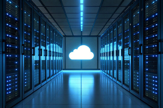 A central cloud icon surrounded by server racks symbolizes modern cloud computing, data storage, and interconnected digital infrastructure solutions.