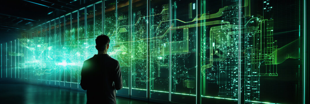 Futuristic Concept: Data Center Chief Technology Officer Holding Laptop, Standing In Warehouse, Information Digitalization Lines Streaming Through Servers. SAAS, Cloud Computing, Web Service