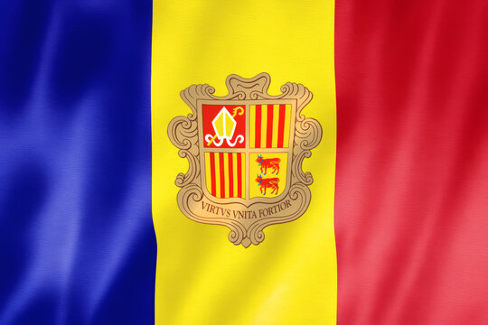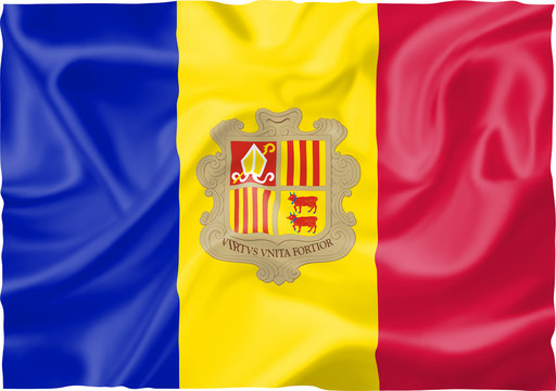 Waving andorra flag displaying coat of arms and motto virtus unita fortior on tricolor banner