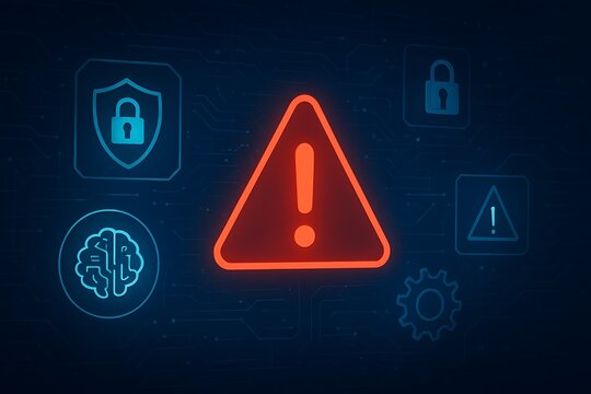 Cybersecurity threat alert with digital warning icons and AI symbols on a futuristic tech background concept for data protection and risk management.