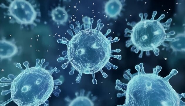 Microscopic enlargement of blue virus - respitory virus outbreak - floating cells in body - virus shaped as covid, influenza, sars, corona, hiv, mers, cholera, variola, measles - disease organisms