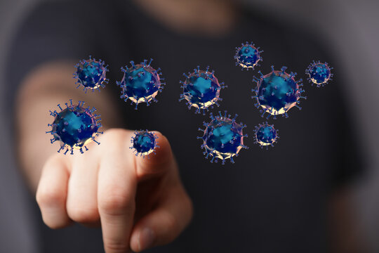 Concept image of a hand pointing at floating virus particles, representing the Covid-19 pandemic, healthcare,