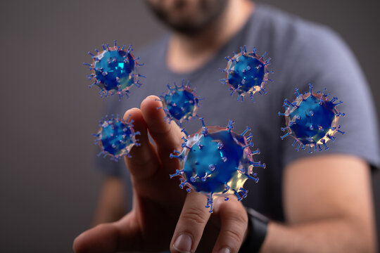 Conceptual image of a man touching floating virus particles, representing health, disease, and the spread of i
