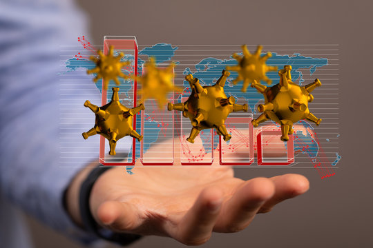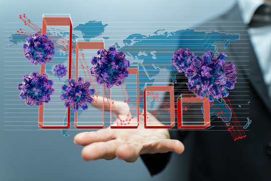 Coworkers analyzing rising data trend with red bar chart and virus overlays in office