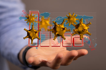 Scientist in hazmat suit analyzing virus on transparent digital interface