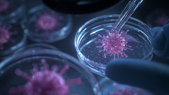A gloved hand filling a syringe from a vaccine vial surrounded by virus models to illustrate immunization procedures and health defense concepts.
