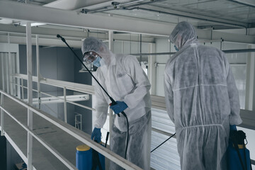 Disinfection of a public place at dawn in the city of quarantine. Infection prevention and control of epidemic. Covid -19.