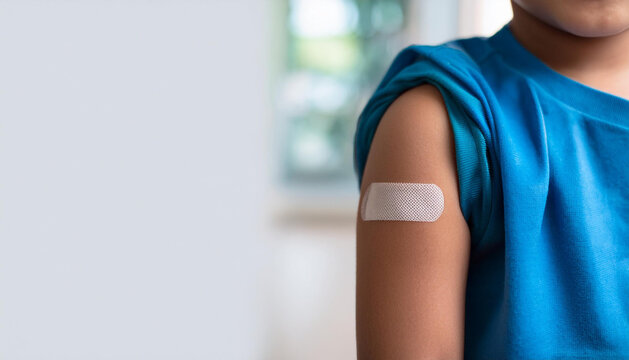 Close up of a child's arm with a rolled up sleeve and a bandage on the upper arm from getting an injection at a physicians office.  Room for text