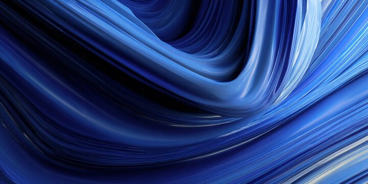 Abstract composition features deep blue flowing, swirling liquid material with highlights
