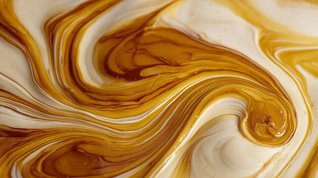 A luscious abstract macro shot featuring fluid, marble-like swirls of rich golden caramel and smooth white vanilla cream, creating elegant organic patterns and a glossy, viscous texture.