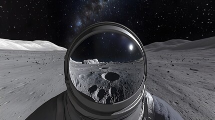 A close-up shot of an astronaut’s helmet visor reflecting the image of Earth as they take a selfie, the curvature of the planet visible in the reflection,