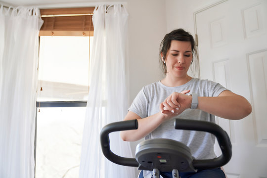 Woman checking time while exercising on stationary bicycle