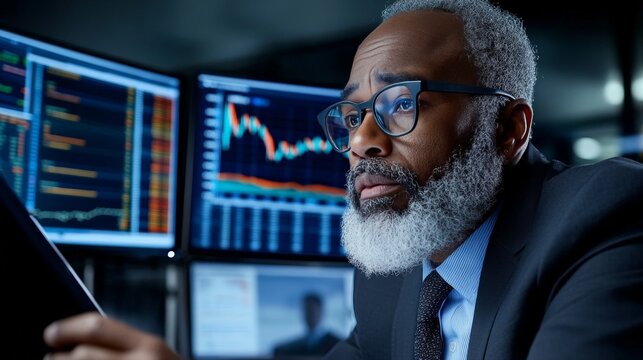 Strategic Visionary: A senior businessman contemplates financial data displayed on a large screen, his thoughtful gaze reflecting years of experience and astute decision-making.