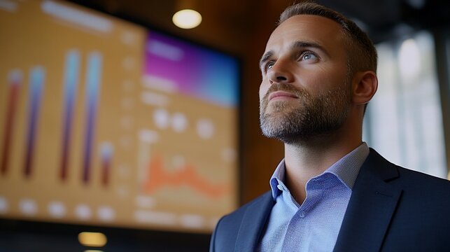 A visionary businessman analyzes data trends, contemplating future strategies and decisions in a modern and dynamic business environment.