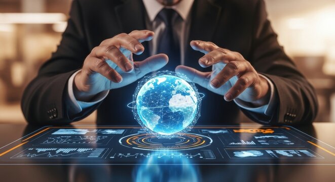 Business visionary controls global network data on futuristic interface, shaping future technology and worldwide connections with precision