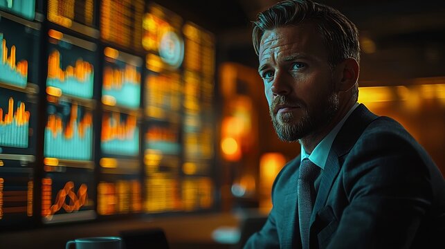 Professional using multiple holographic displays with AI-driven financial dashboards. Concept of global economy, digital markets, fintech intelligence, and business technology innovation. Collage