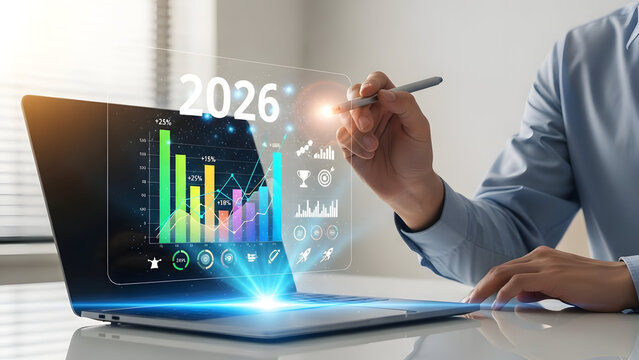 Photo of visionary businessman touching 2026 hologram with financial data, forecasting future success and growth in business and technology innovation
