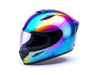 Iridescent motorcycle helmet with a clear visor against a white backdrop