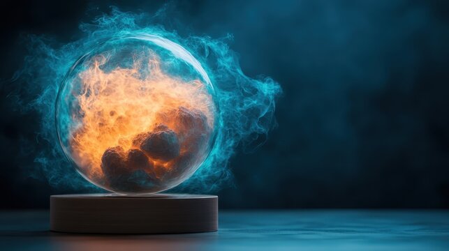 An enchanting visual of a glowing sphere containing flames and smoke intertwining, suggesting powerful energy and abstract concepts of life and transformation.