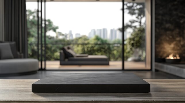 Wooden table with blurred modern home interior background ideal for product display and promotional montages in contemporary living spaces