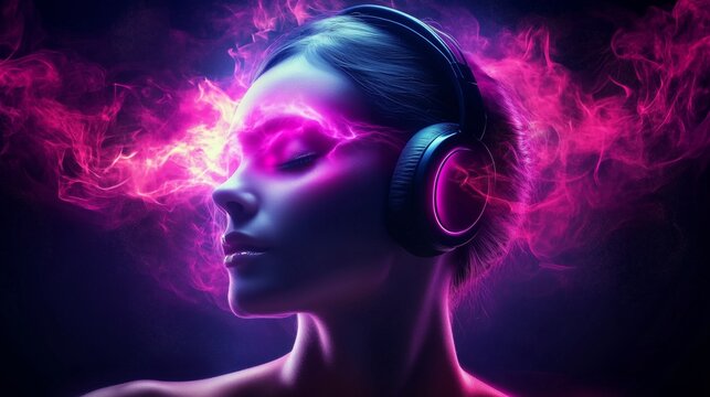 Woman enjoying music with headphones and colorful visual effects at night