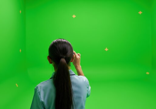 Girl in green screen studio taking photo
