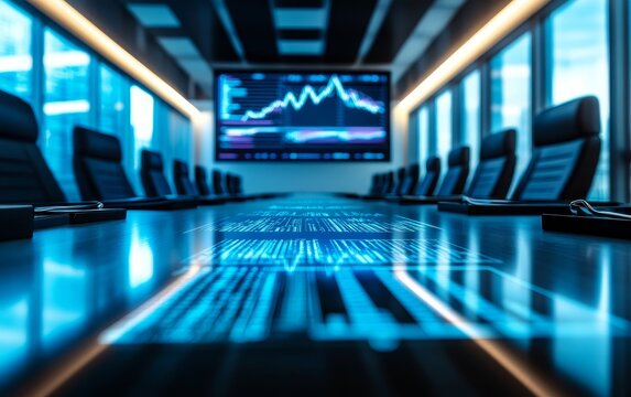A modern conference room with a digital display showing data trends, designed for business meetings and presentations.