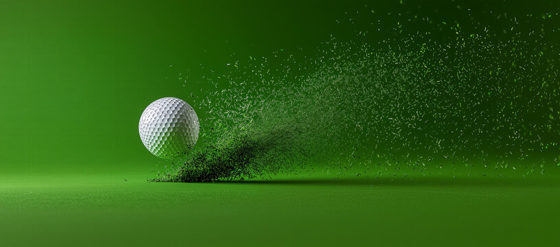 Dynamic studio mockup showcasing a golf ball in motion with a vibrant green background, emphasizing the impact of a powerful golf swing