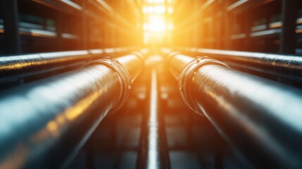 The image captures metallic pipes radiating warmth with soft light, serving as a visual metaphor for industry and technology with a hint of artistry in a structural view.