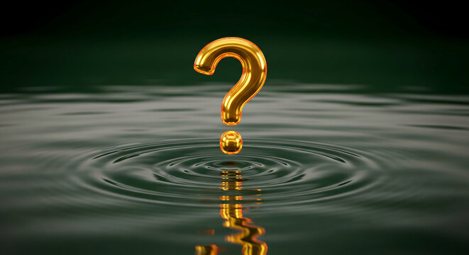 Golden question mark above water with concentric ripples. Represents doubt, uncertainty, or inquiry, over liquid, creating a visual metaphor