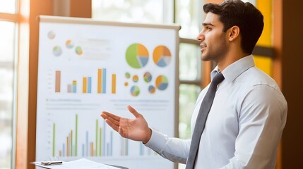 Data analyst explaining chart presentation in modern office